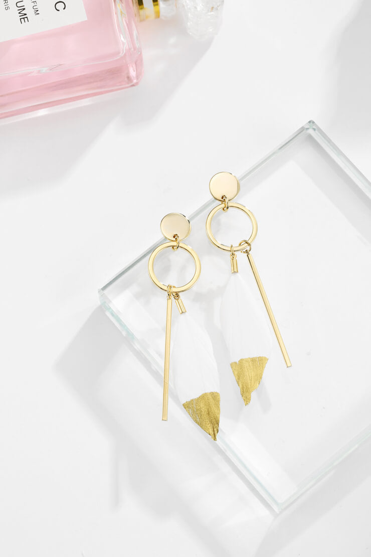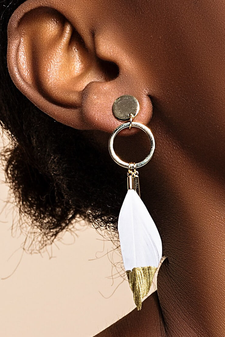 Embrace your inner hippy chick with these gold-dipped feather earrings. Combining chic edgy styling with the whimsy of feathers. These are perfect for day or night.