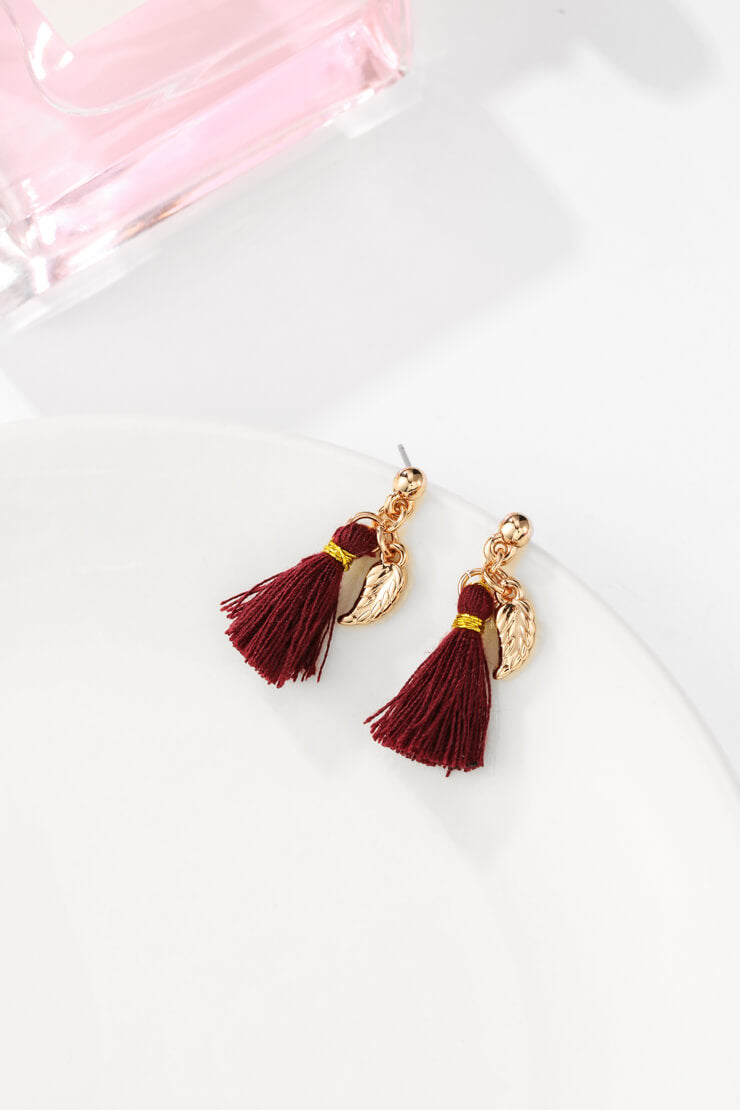 Delicate, mini tassels in deep burgundy combined with gold accents and exquisite gold feathers for a look that is fun, understated yet unconventional.