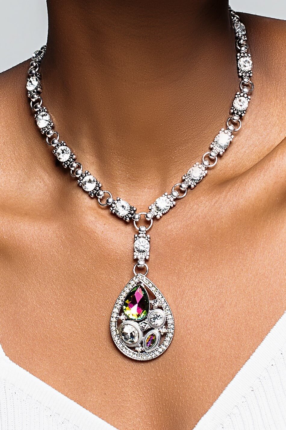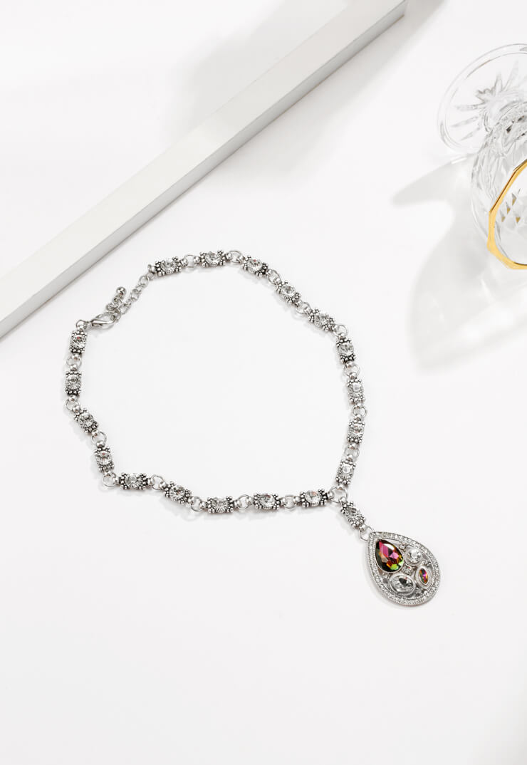 This silver vintage inspired piece has delicate intricacies filled with diamontie gems and a statement teardrop with a cluster of jewels.