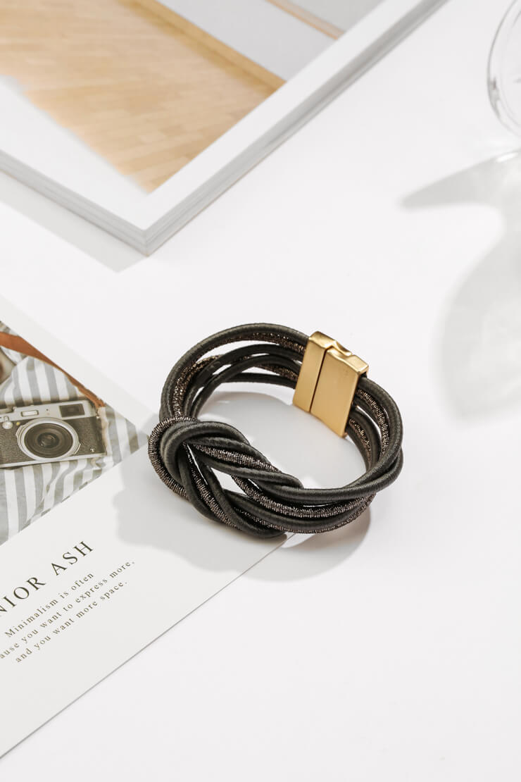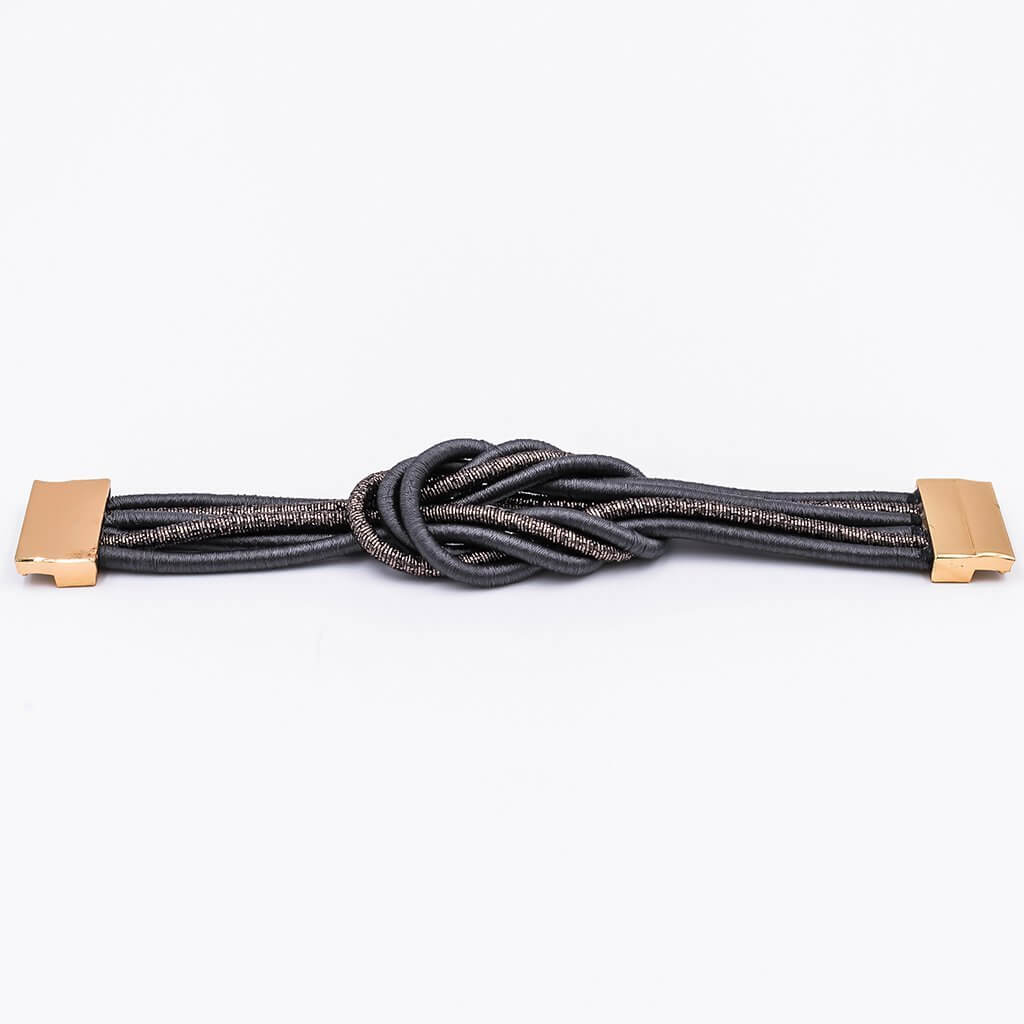 The simplicity of this bold statement piece is entwined with silver metallic and charcoal rope, making this an adventurous piece showing your fearless side.