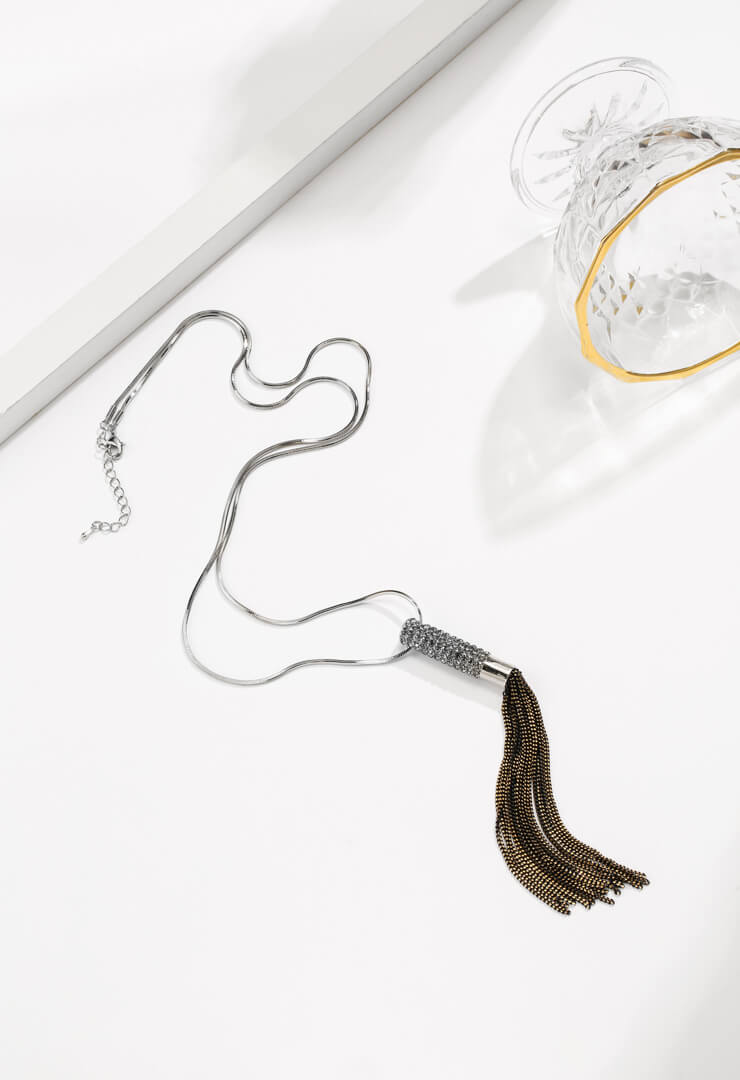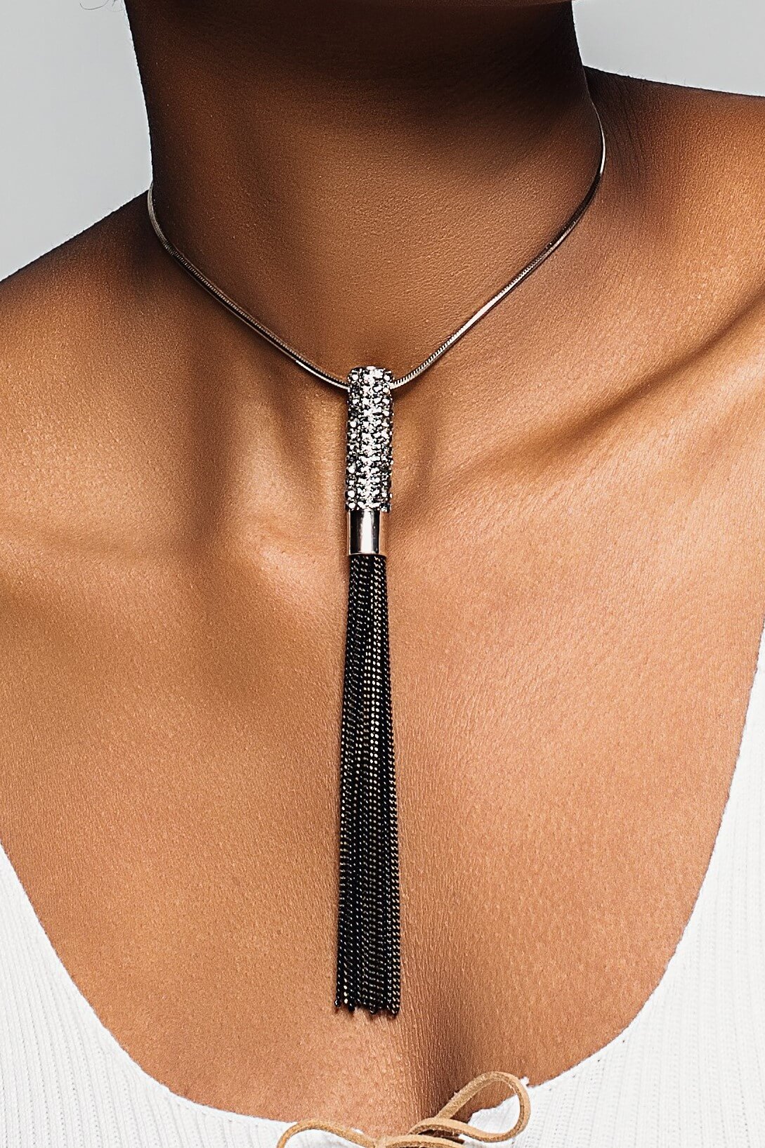 Envision being swept away on a Persian carpet and feeling the magic that this beautiful world has to give. Jasmine, a black chained tassel necklace uniquely adorned with black diamonds reminds us that life is indeed remarkable and splendid.
