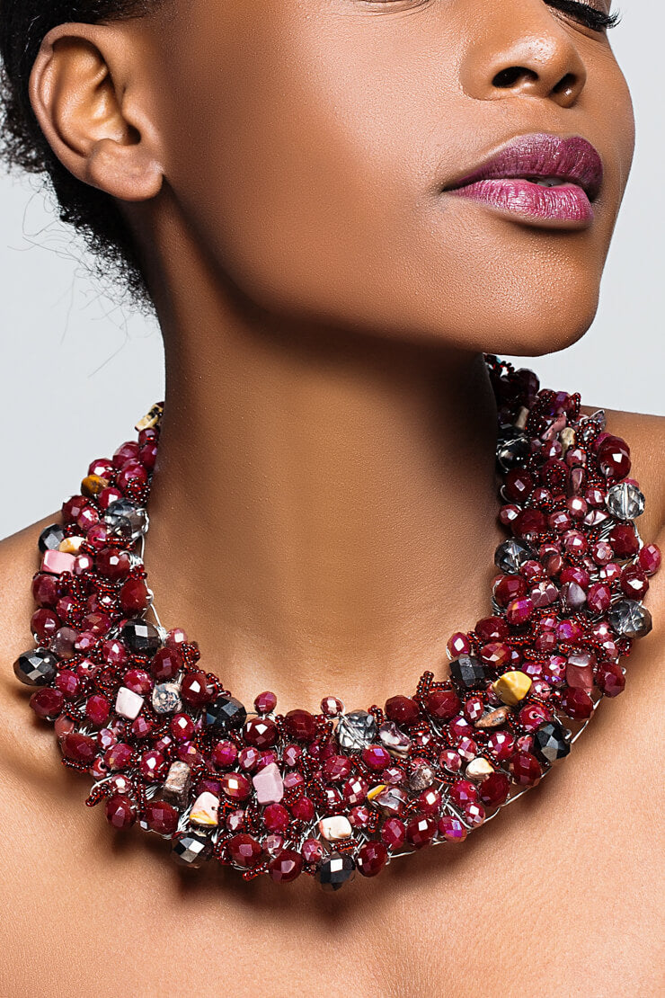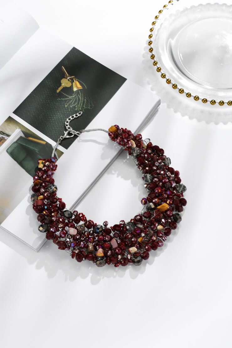 This bold bib statement necklace is handcrafted with natural gemstones. Each stone is individually wired with genuine rich variations of scarlet red and silver gems. Inspired by a woman who was fierce in every way. La Tita Melli is the fire in you that awakens with strong emotion. She loves passionately and fights hard. Her fierceness within conquers all with love.