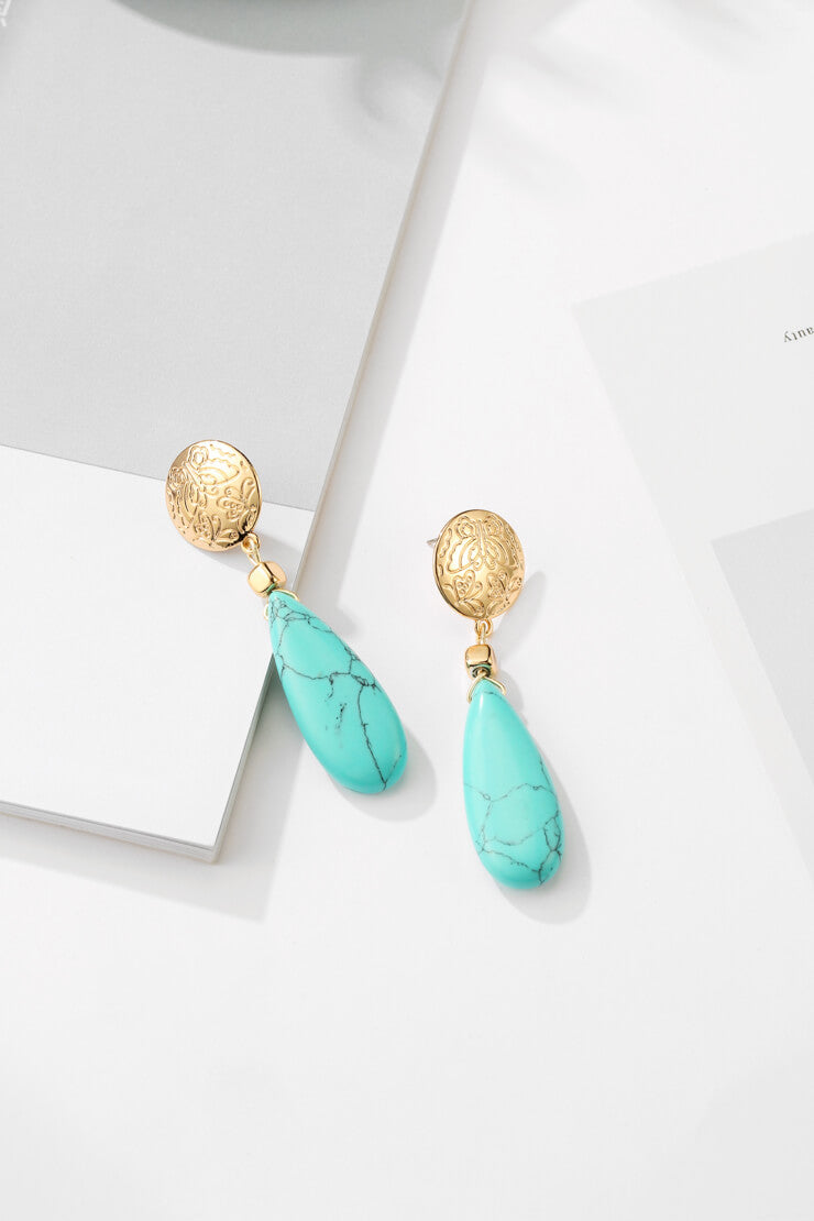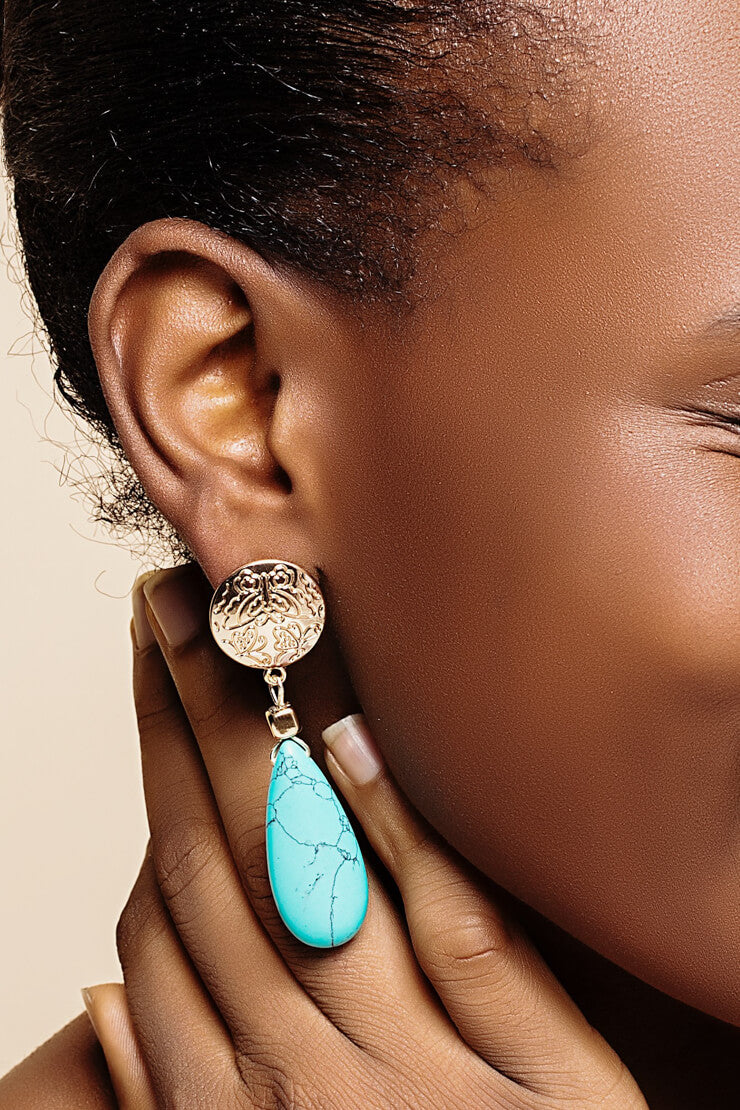Bohemian, nature-lover, eccentric flower child, she doesn't care for names, she's heard them before & none of them define her. Large turquoise/howlite drops offset by gold buttons with subtle butterfly patterns make this perfect for the nature loving free spirit.