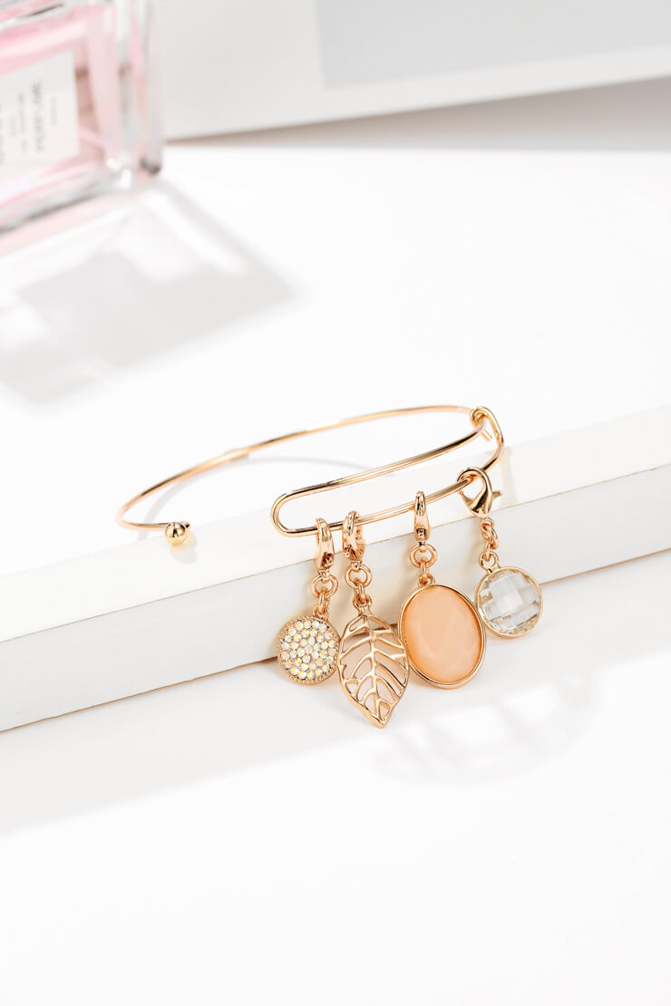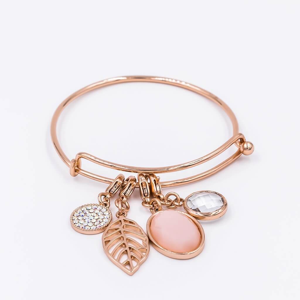 Love attraction has a romantic twist with detailed luxe charms. Beautifully embellished with a clear crystal, rose pink moonstone, hollow rose gold leaf and pavé setting detachable charms.