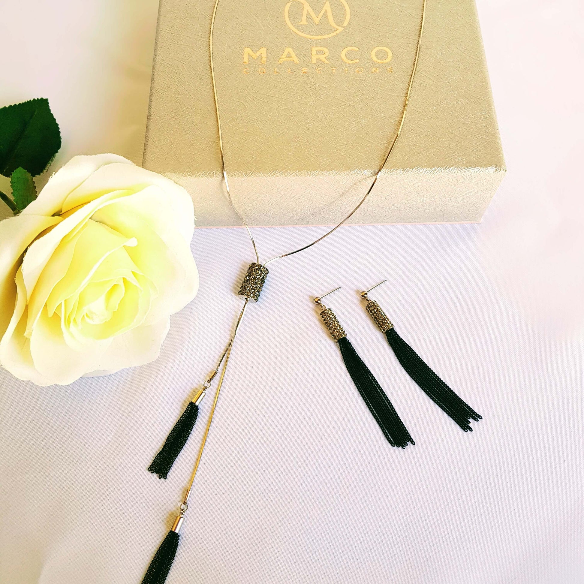 Mystique is an assembly of black diamonds cascading into black chain tassels.