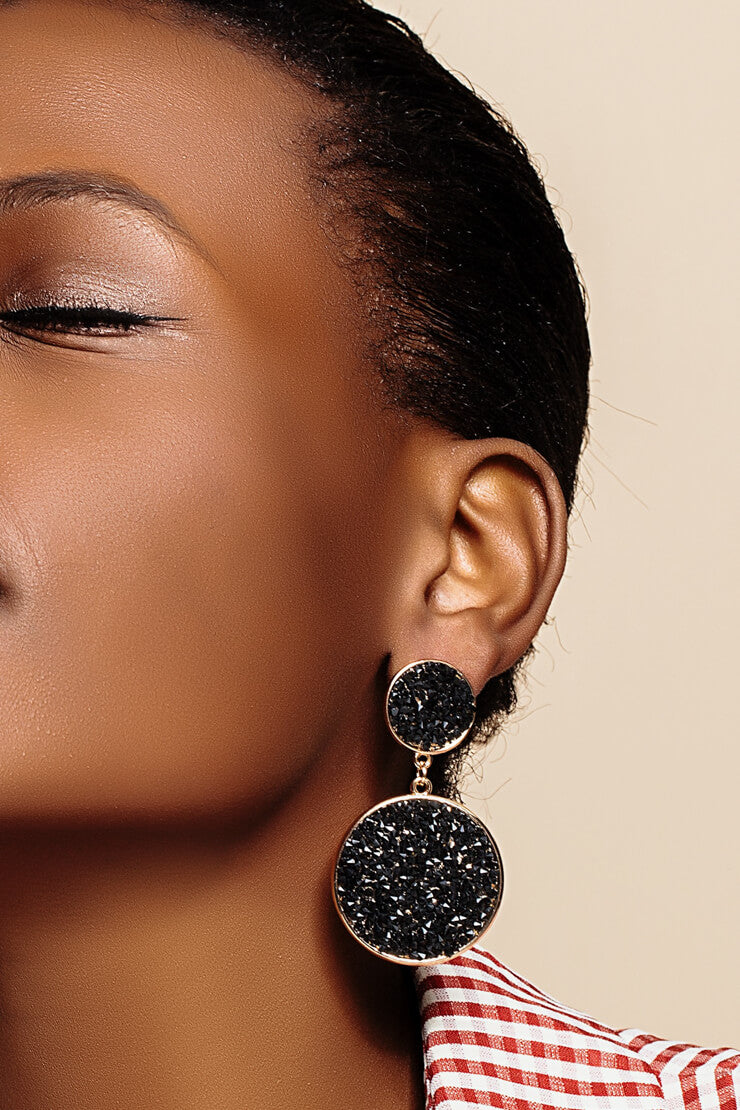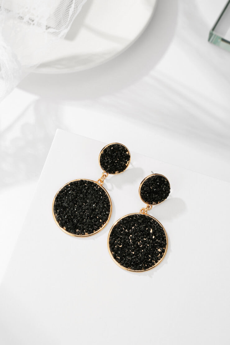 Black diamond aggregate displayed on large gold circles creates a sophisticated look for the discerning woman.