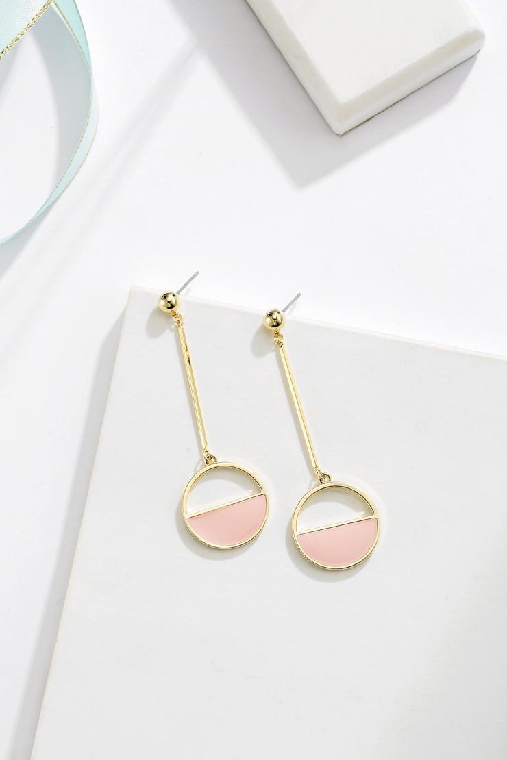 Cute, quirky, soft and feminine. She is unique in her expression of her personal style & understands that it's the little details that can make or break an outfit. These gold drop earrings feature circles half filled with pink enamel to bring an element of fun to any outfit.