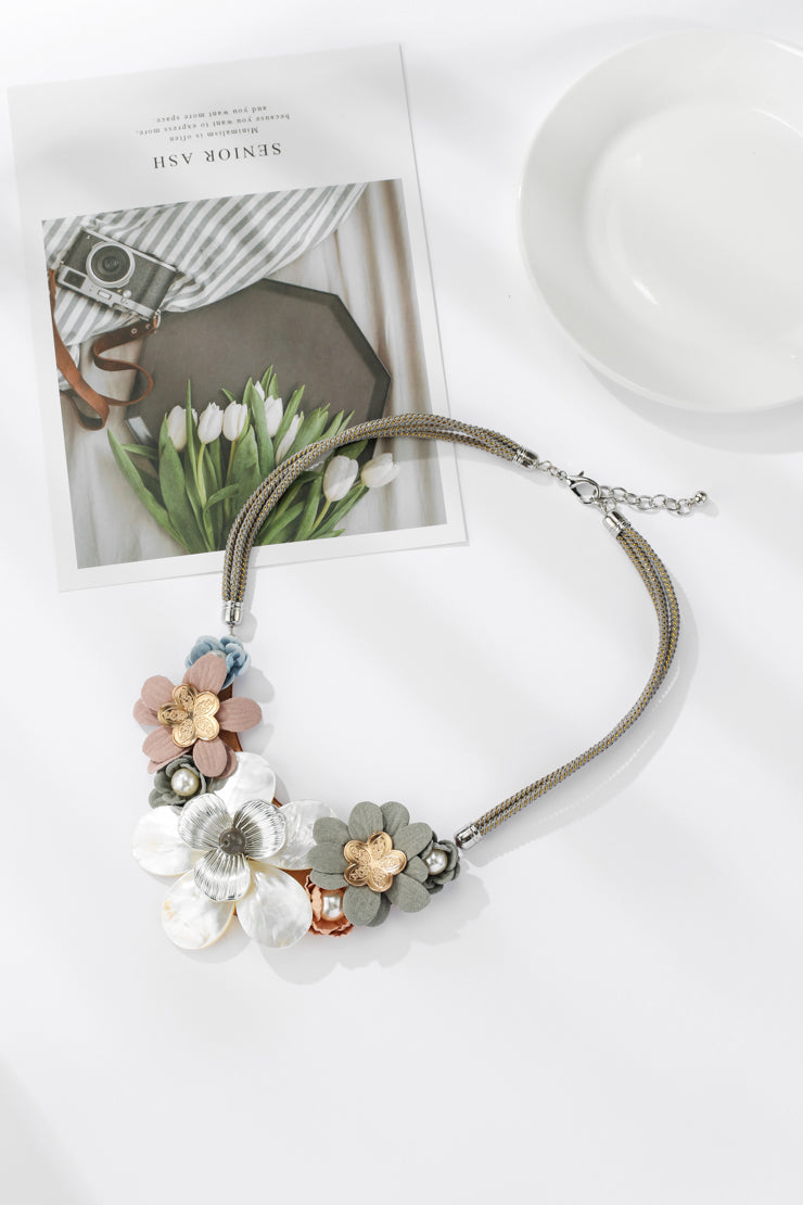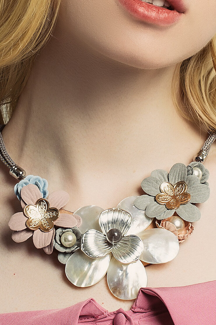 This gorgeous embellishment of flowers is embedded on a leather base. Showcasing mother of pearl petals and detail leather and gold garnish.