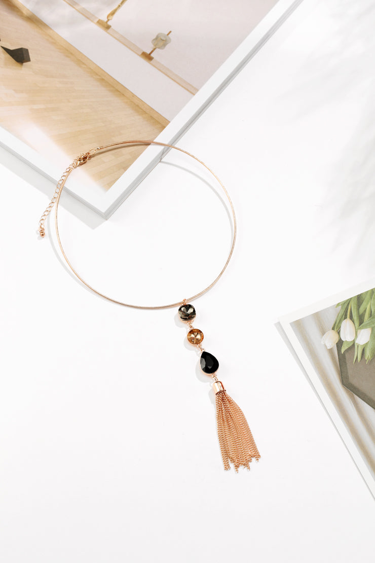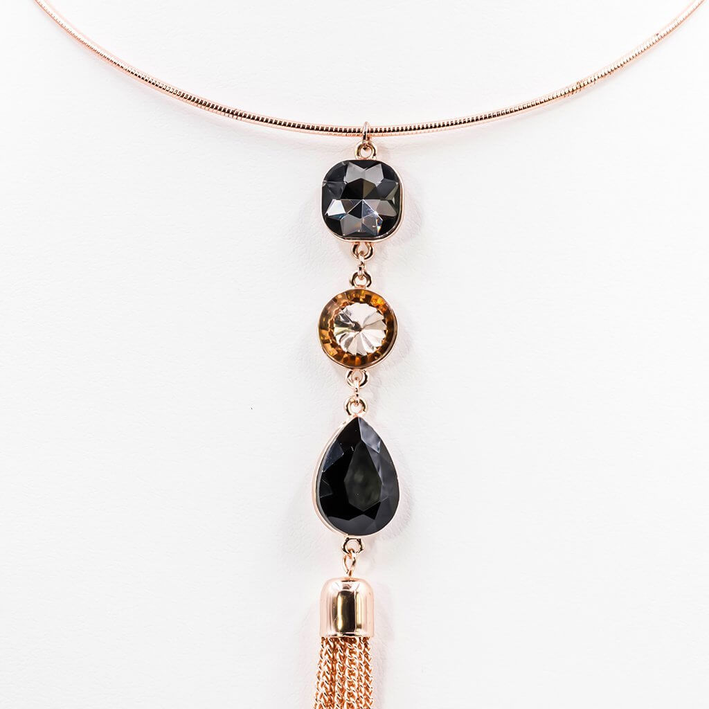 The Trinity is a blend of rose gold finish omega chain, with a centred trio of gems. This minimalist piece is crafted with smokey grey, champagne and jet black rhinestones accompanied by a descending collection of chain tassels.