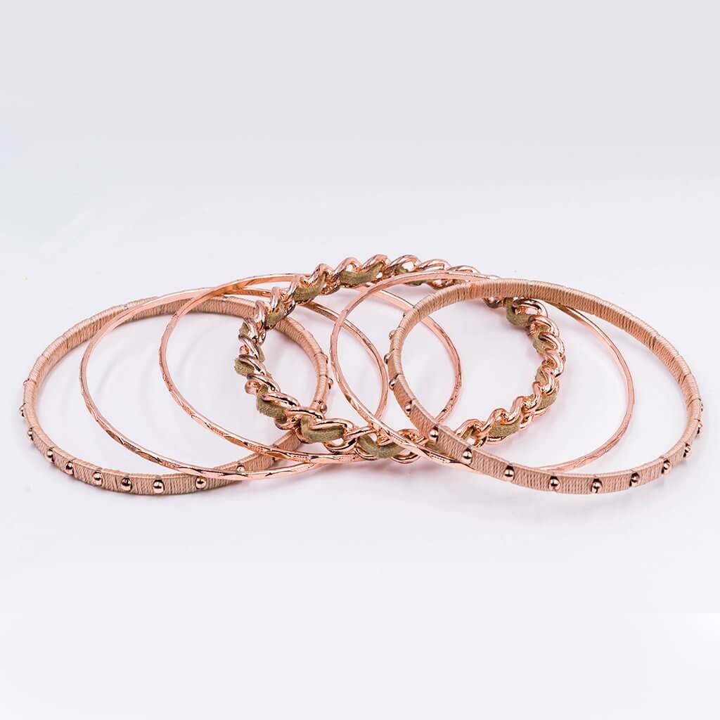 A beautiful combo of gentle rose gold plated bangles and delicate fusion of textures and elaborate leather braided through.